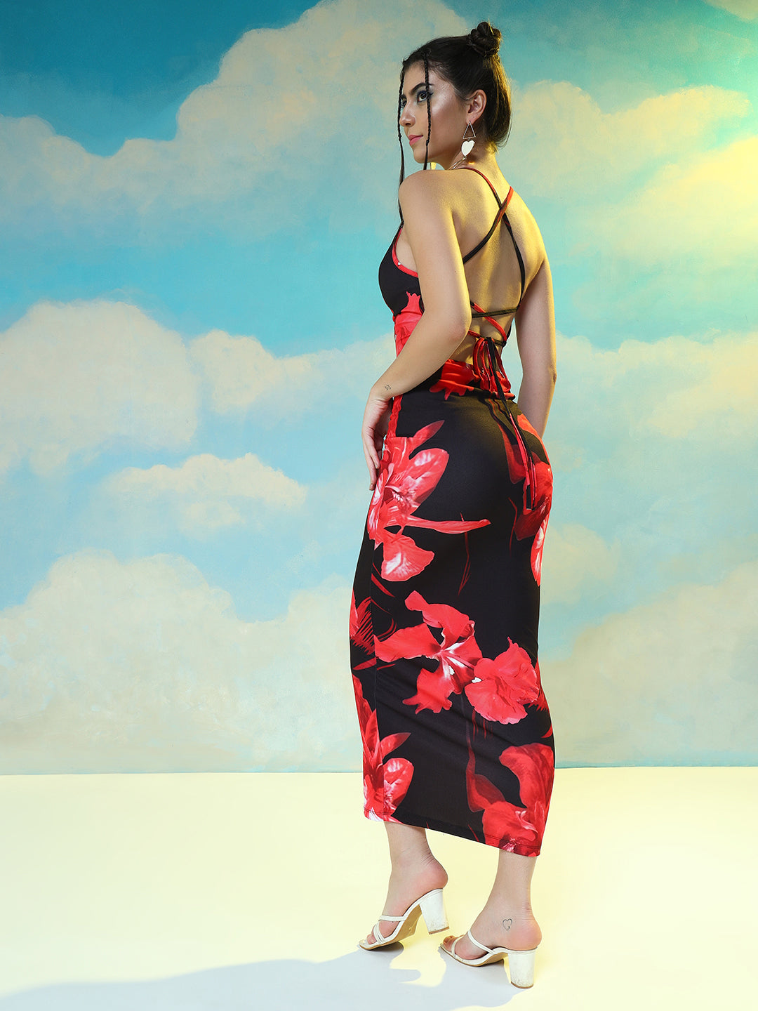 This exquisite red and black floral dress is designed to make a bold statement. Crafted from high-quality fabric, it features a vibrant floral pattern that beautifully contrasts with the rich black background.