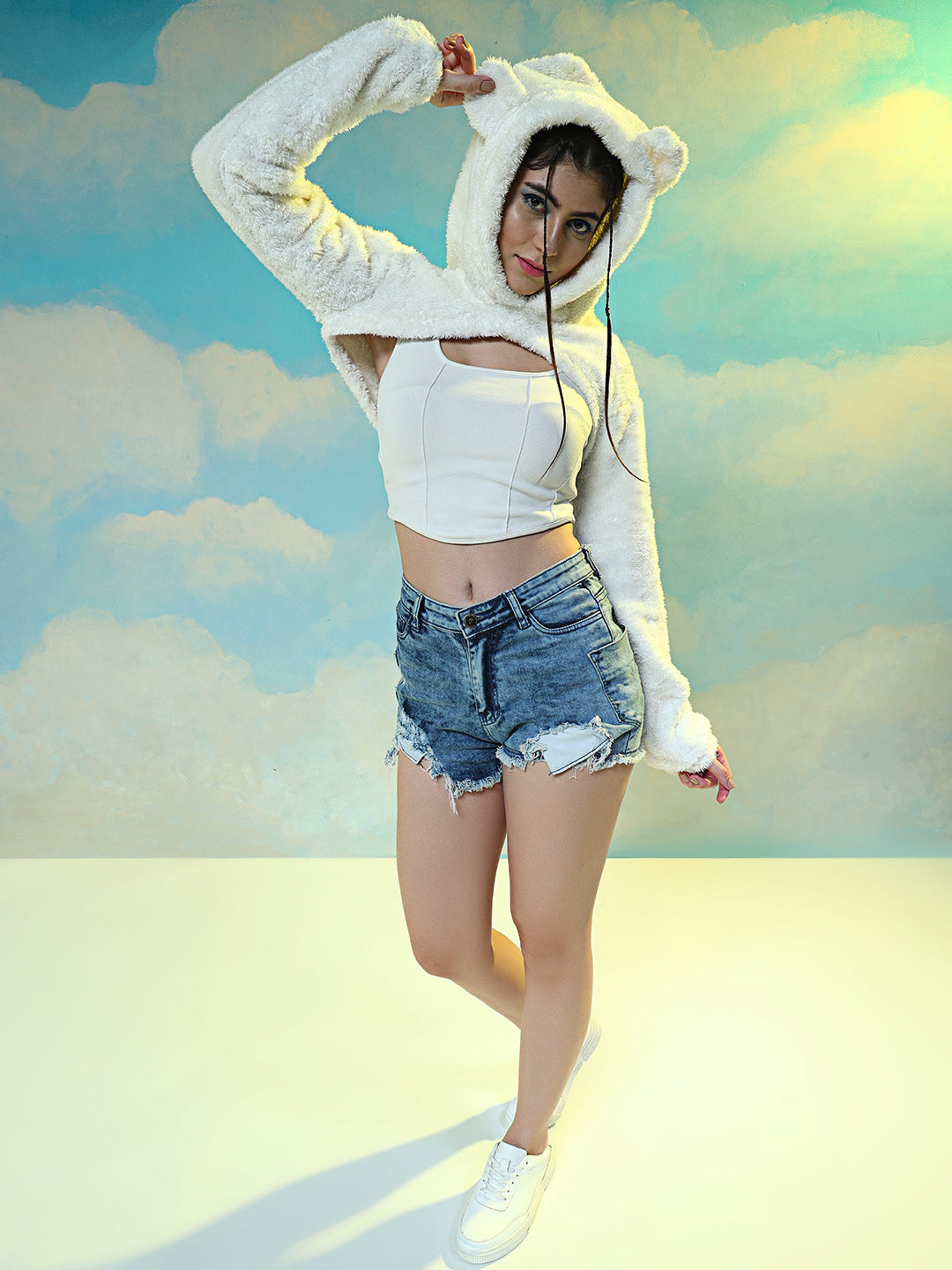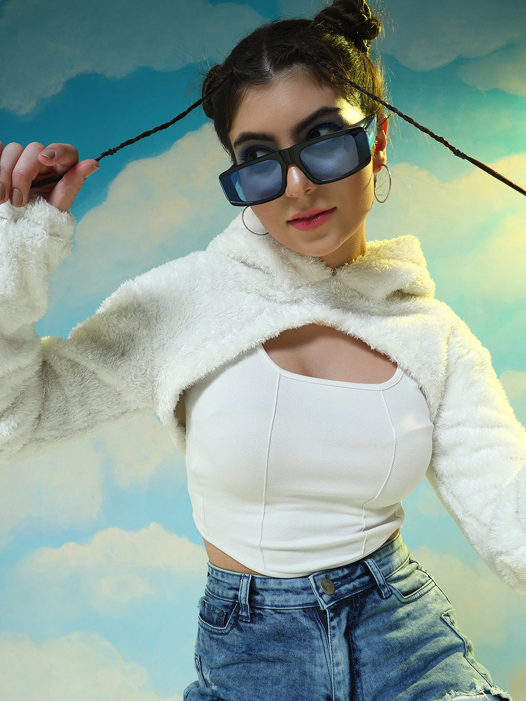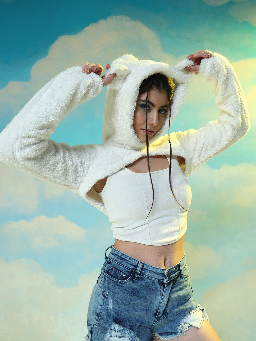 Step out in style with the TANDUL Women Self Design Cape Jacket. Made with soft faux fur fabric, this white cape jacket features a self design pattern and a hooded neckline for added warmth and style. Perfect for any occasion, it's ideal for layering or wearing on its own as a statement piece. Machine washable for easy care and maintenance.
