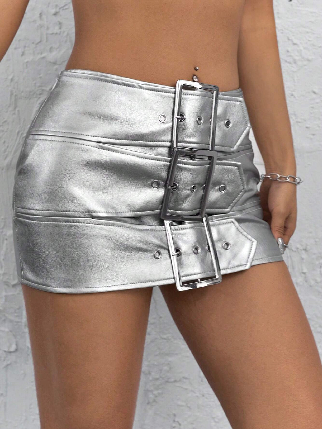 The high-quality leather ensures durability and comfort, while the metallic finish adds a touch of glamour to any ensemble. Embrace your individuality and make a bold statement with this must-have skirt.