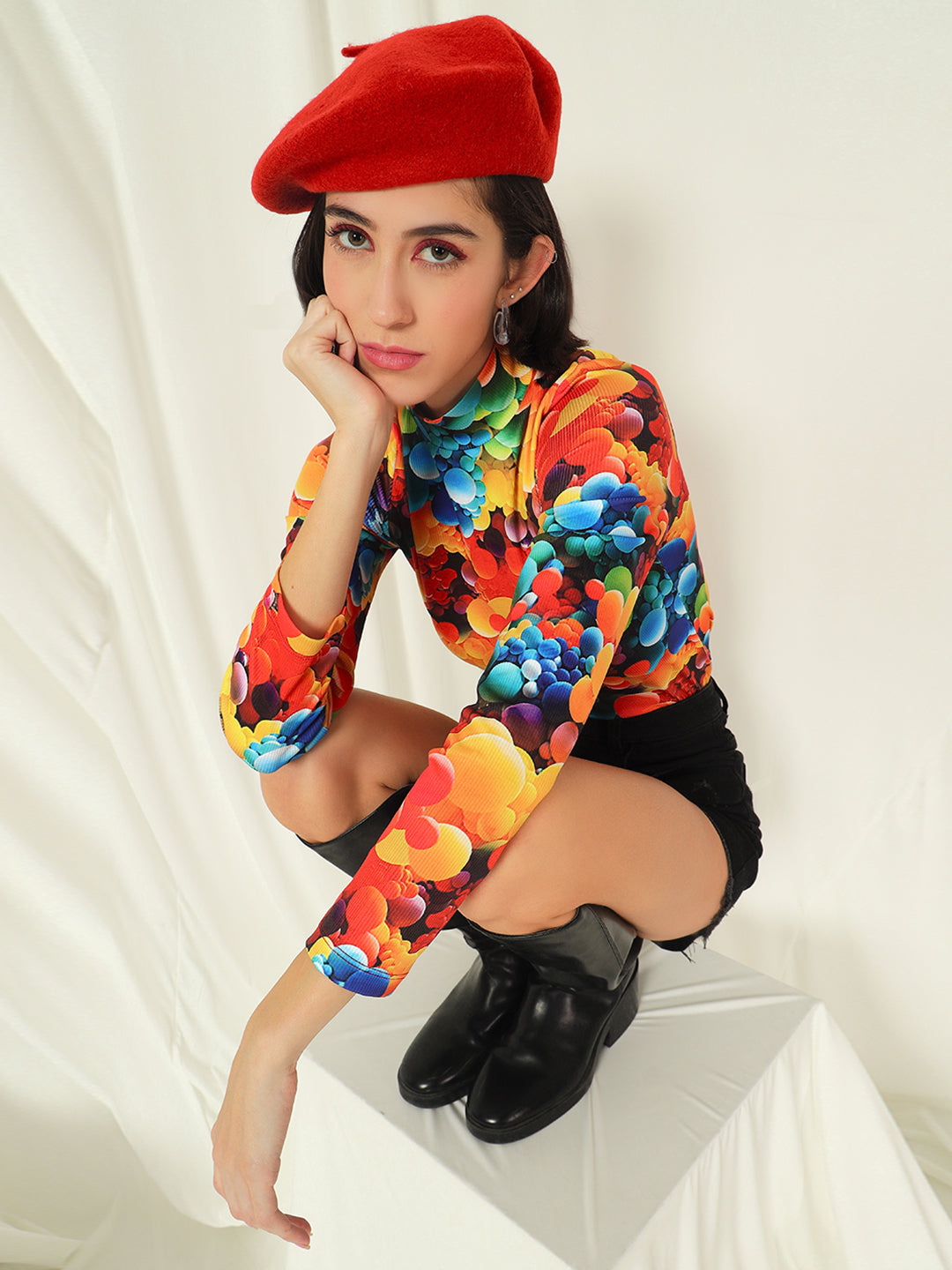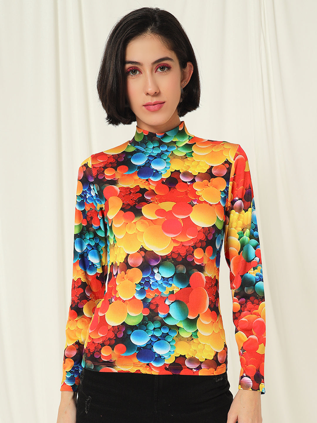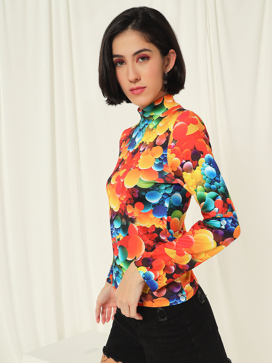 Introducing TANDUL's Women Graphic Print High Neck Multicolor Sweater. Made with soft and cozy fleece fabric, this sweater features a stylish graphic print and a high neck for added warmth. Perfect for western wear, this sweater is best cared for with regular machine wash. Available in one pack, ideal for any woman's wardrobe.
