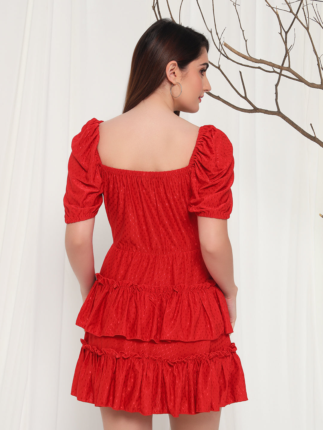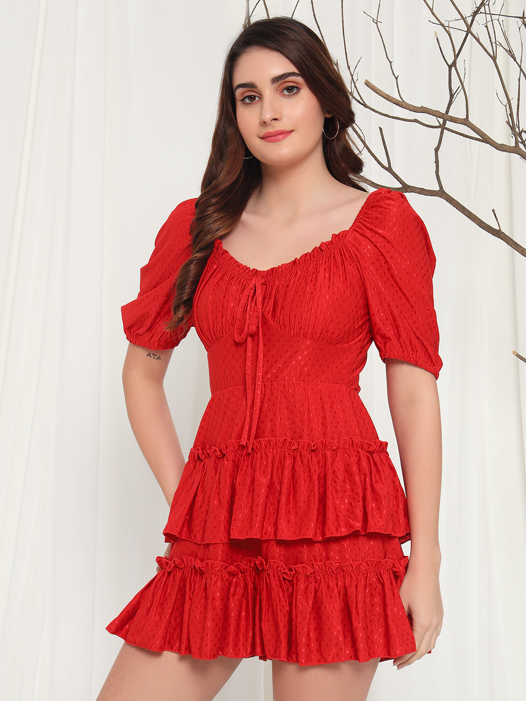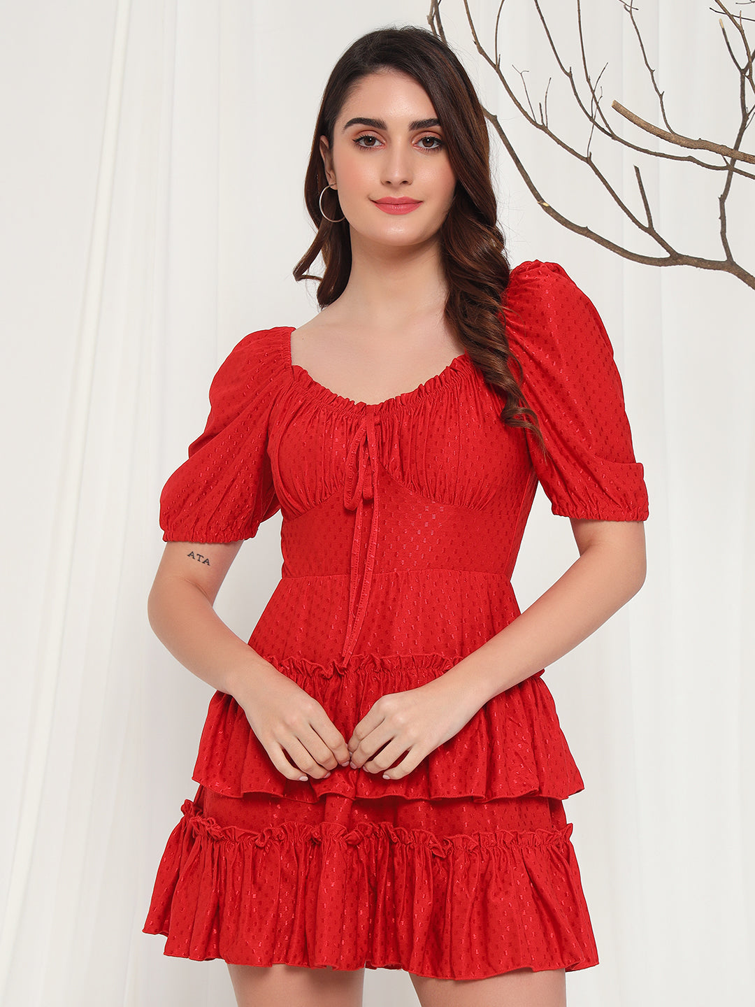 Elevate your style with TANDUL Women's Fit and Flare Red Dress. Made from a comfortable Lycra blend, this dress features a tie-up neck and playful puff sleeves. Ideal for western wear, it's perfect for any occasion with its vibrant red color and above knee length. Get ready to turn heads with this solid patterned dress.