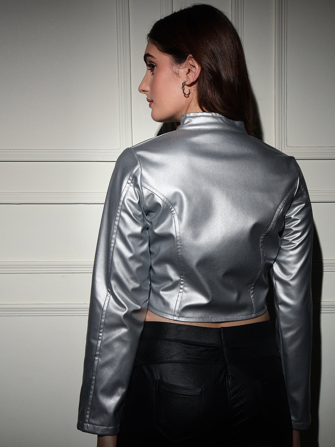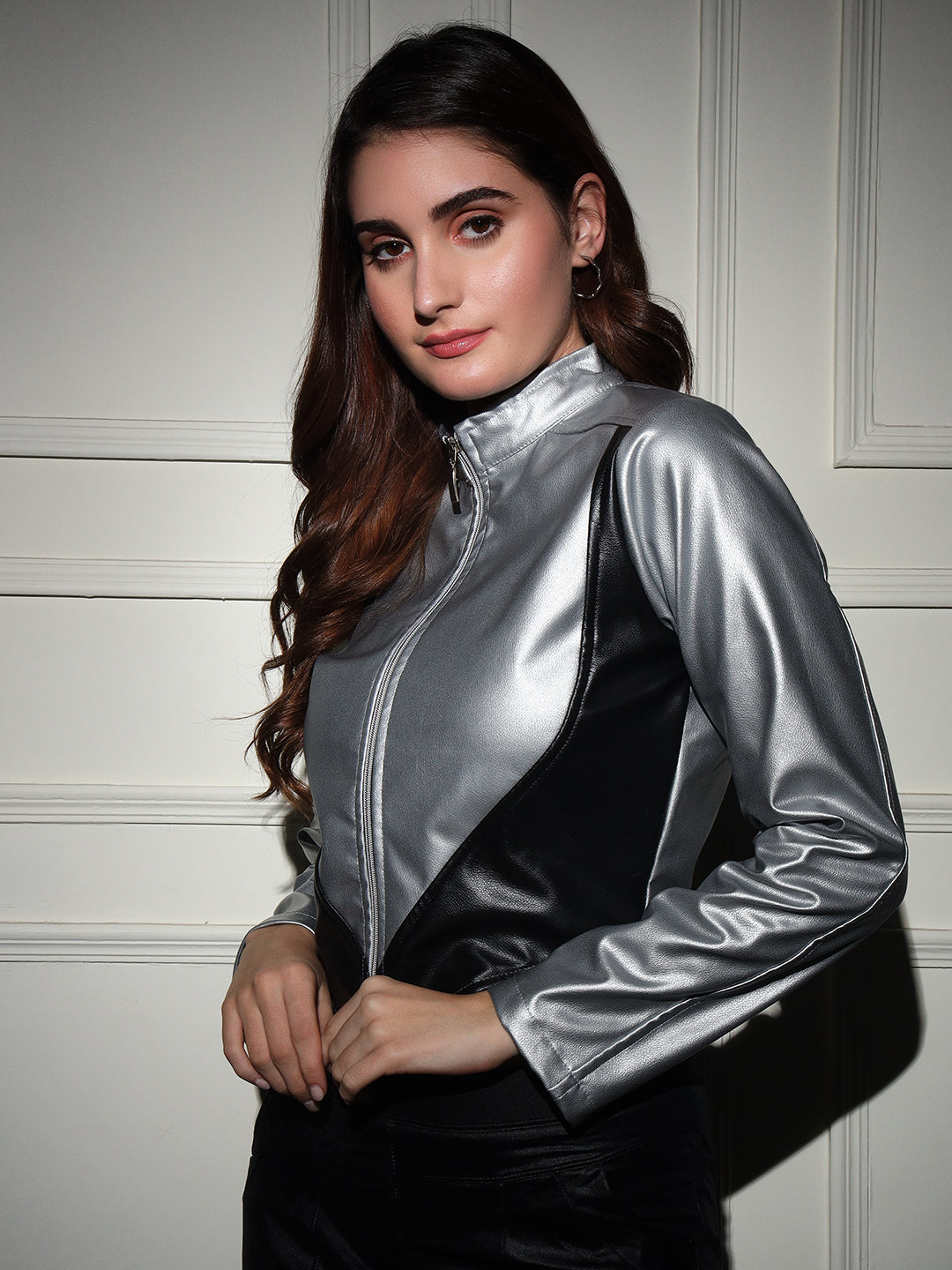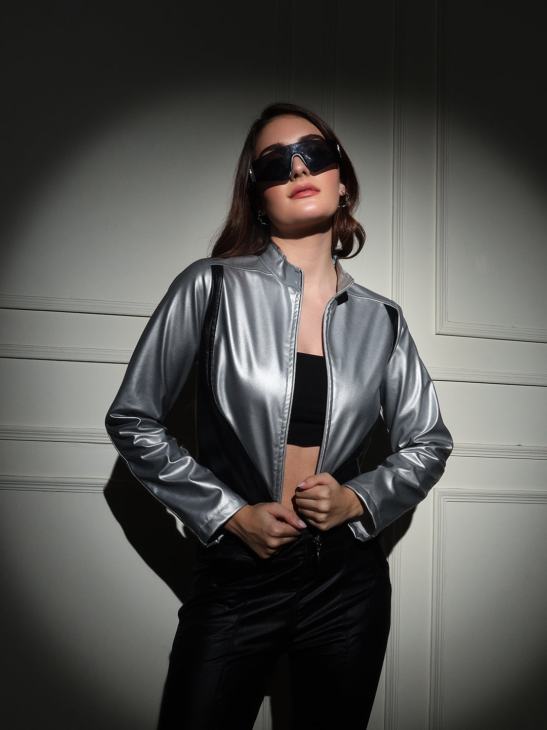 Introducing the TANDUL Women Solid Leather Jacket, perfect for modern Western wear. Made with a gentle machine washable, faux leather fabric and featuring a full sleeve design, this jacket is both stylish and functional. With its sleek silver color and mandarin collar, you'll make a statement wherever you go.