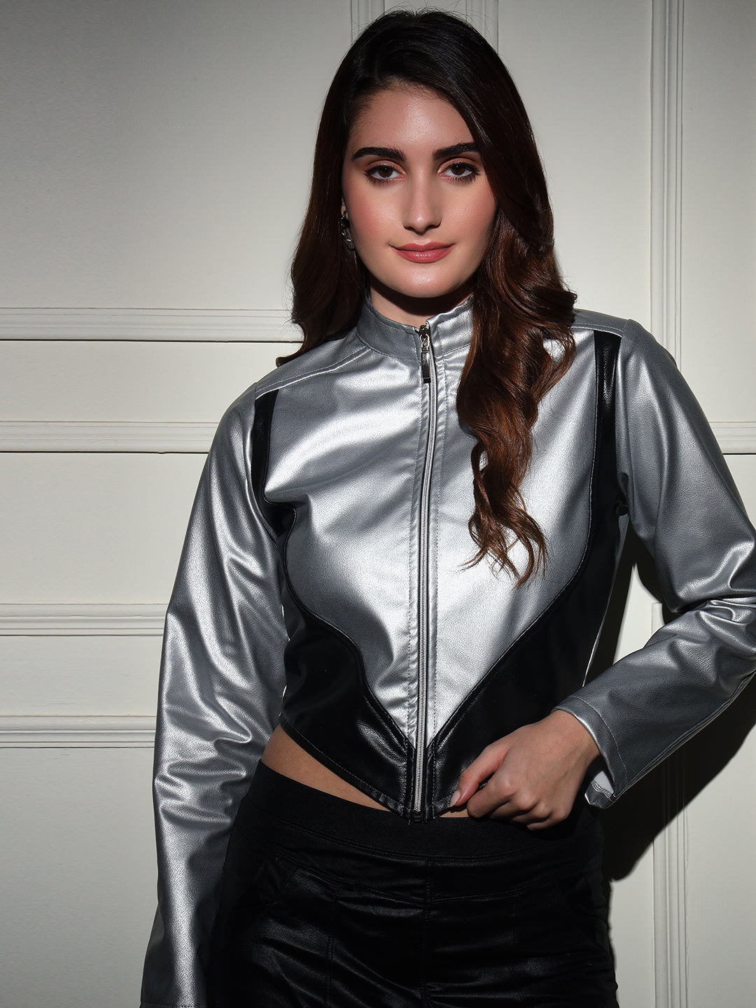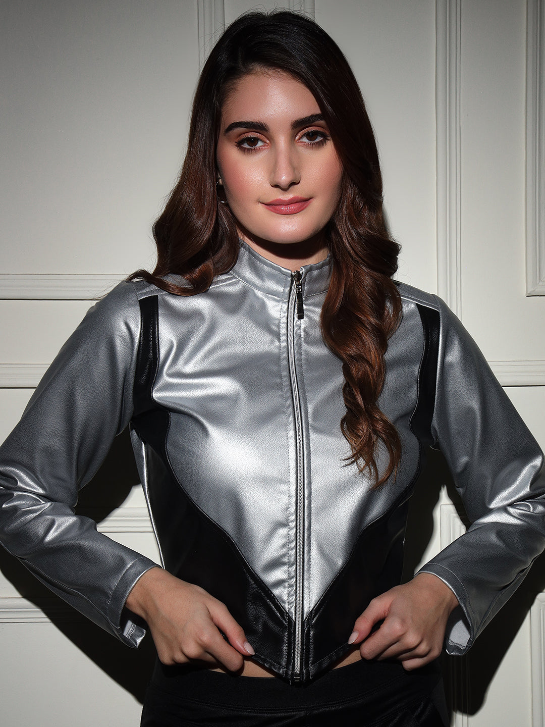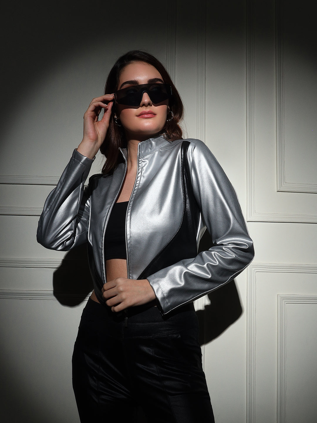 Introducing the TANDUL Women Solid Leather Jacket, perfect for modern Western wear. Made with a gentle machine washable, faux leather fabric and featuring a full sleeve design, this jacket is both stylish and functional. With its sleek silver color and mandarin collar, you'll make a statement wherever you go.