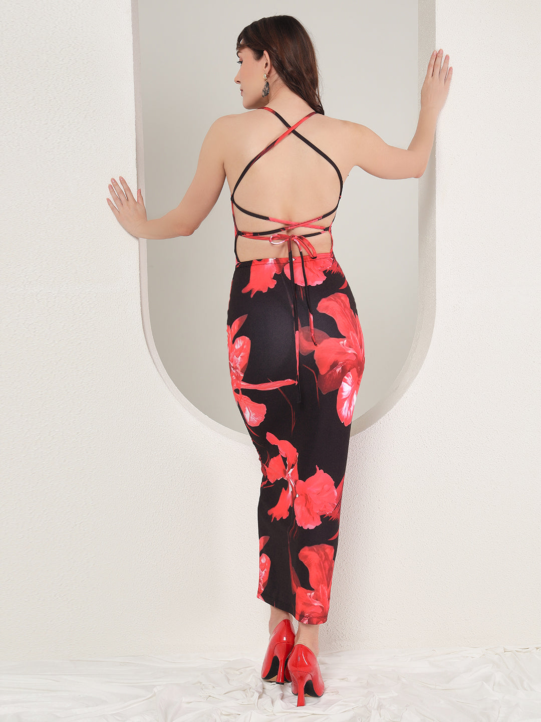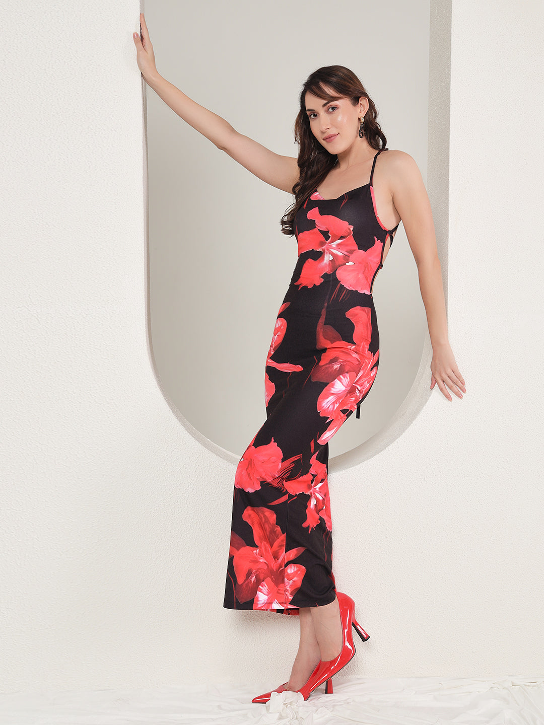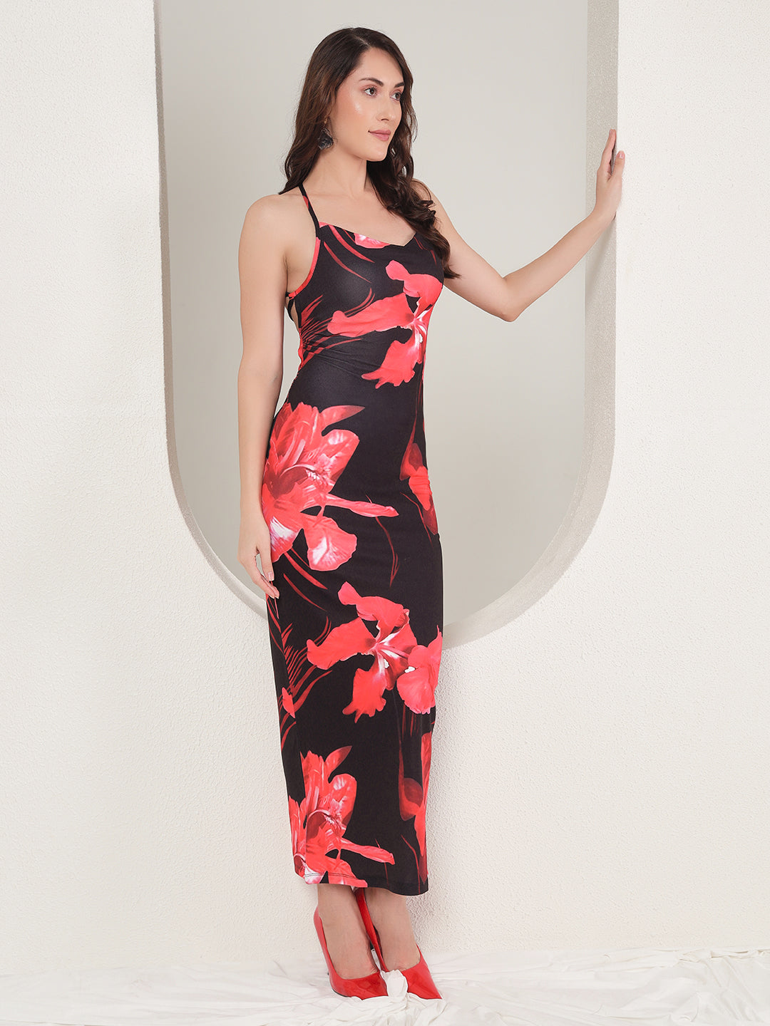 TANDUL's Women Bodycon Black Dress is perfect for any occasion. Made of Lycra blend, this ankle-length dress features a printed pattern and a square neckline. Its sleeveless design exudes a chic and modern look, making it the ideal choice for western wear.