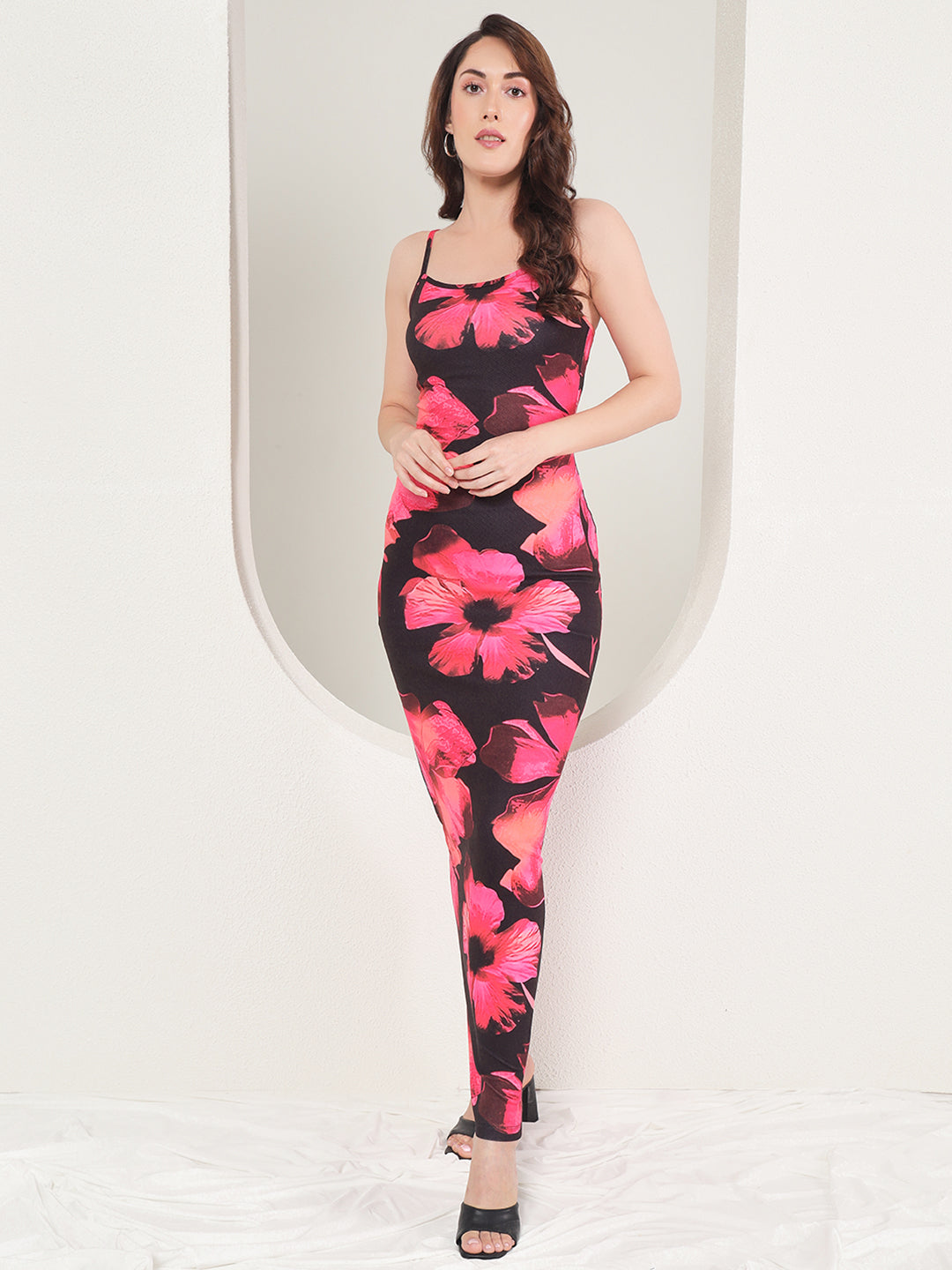 The TANDUL Women Bodycon Black Dress is perfect for any occasion. Made from a Lycra blend fabric, it boasts an ankle length and square neck design. The printed pattern adds a touch of interest, making it a stylish and comfortable option for western wear. Ideal for women, this sleeveless dress is a must-have in any wardrobe.