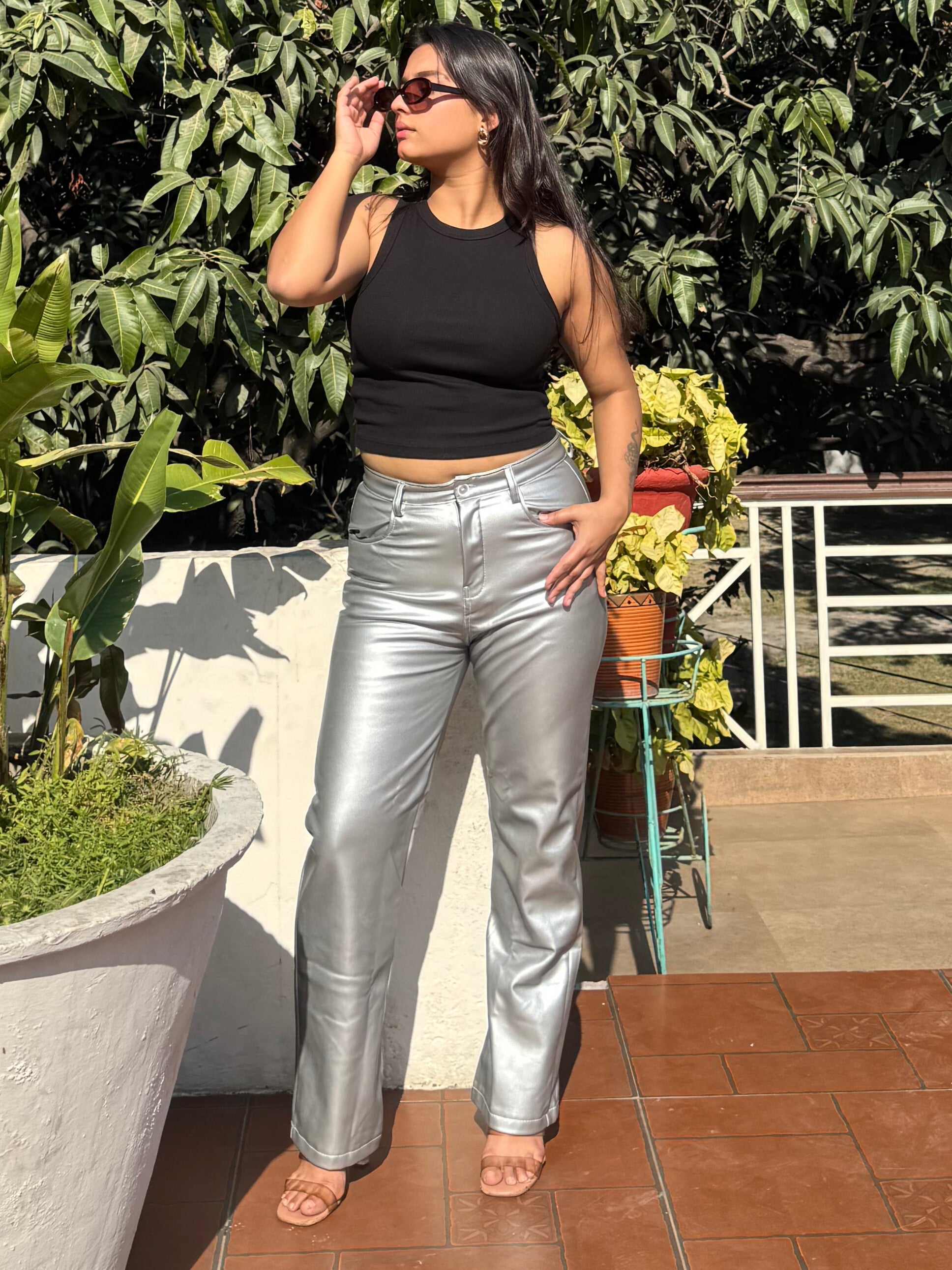 TANDUL Women Regular Fit Silver Faux Leather Trousers