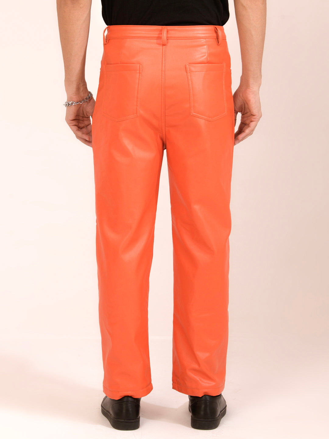 Revamp your wardrobe with the TANDUL Men's Regular Fit Orange Faux Leather Trousers. With a tailored fit, they are perfect for casual occasions and pair well with western wear. Made with faux leather fabric, they boast a mid-rise and solid pattern. Dry clean only for long lasting wear. Perfect for all seasons!