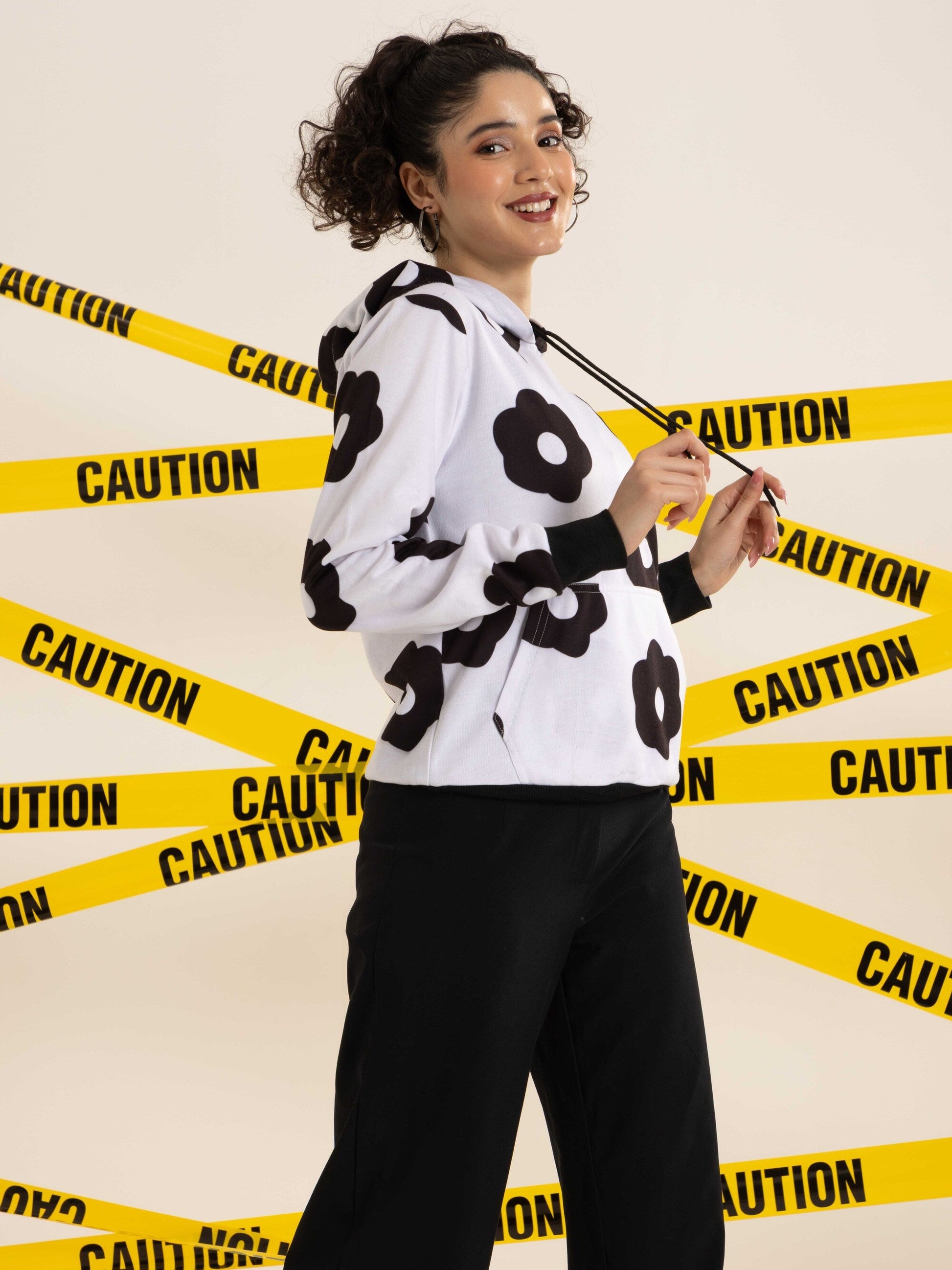 TANDUL Women Black and White Floral Hoodie