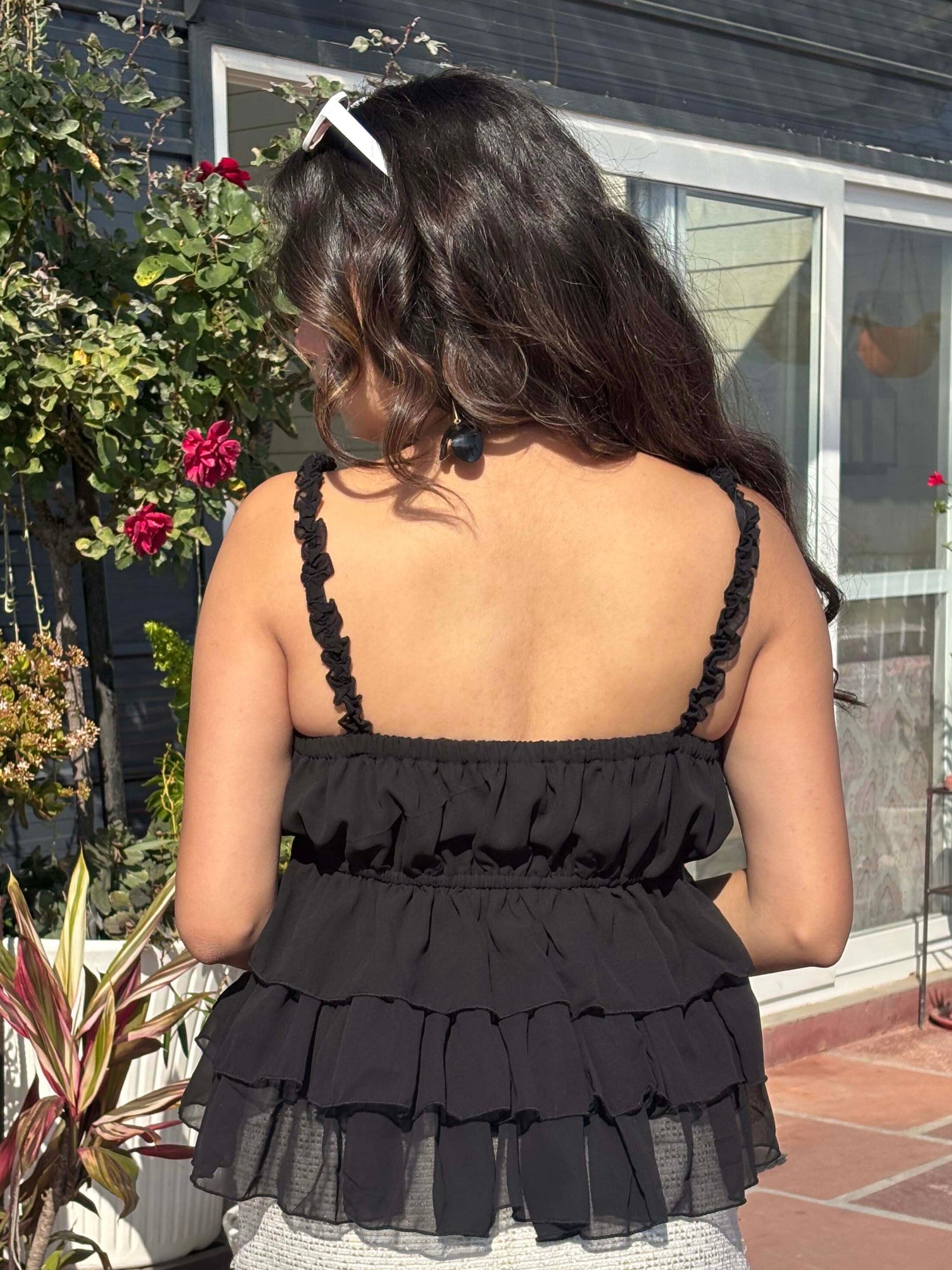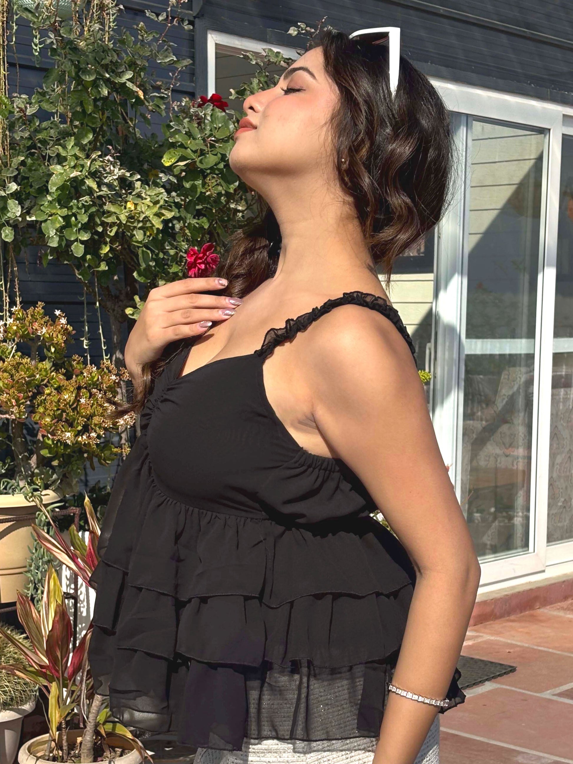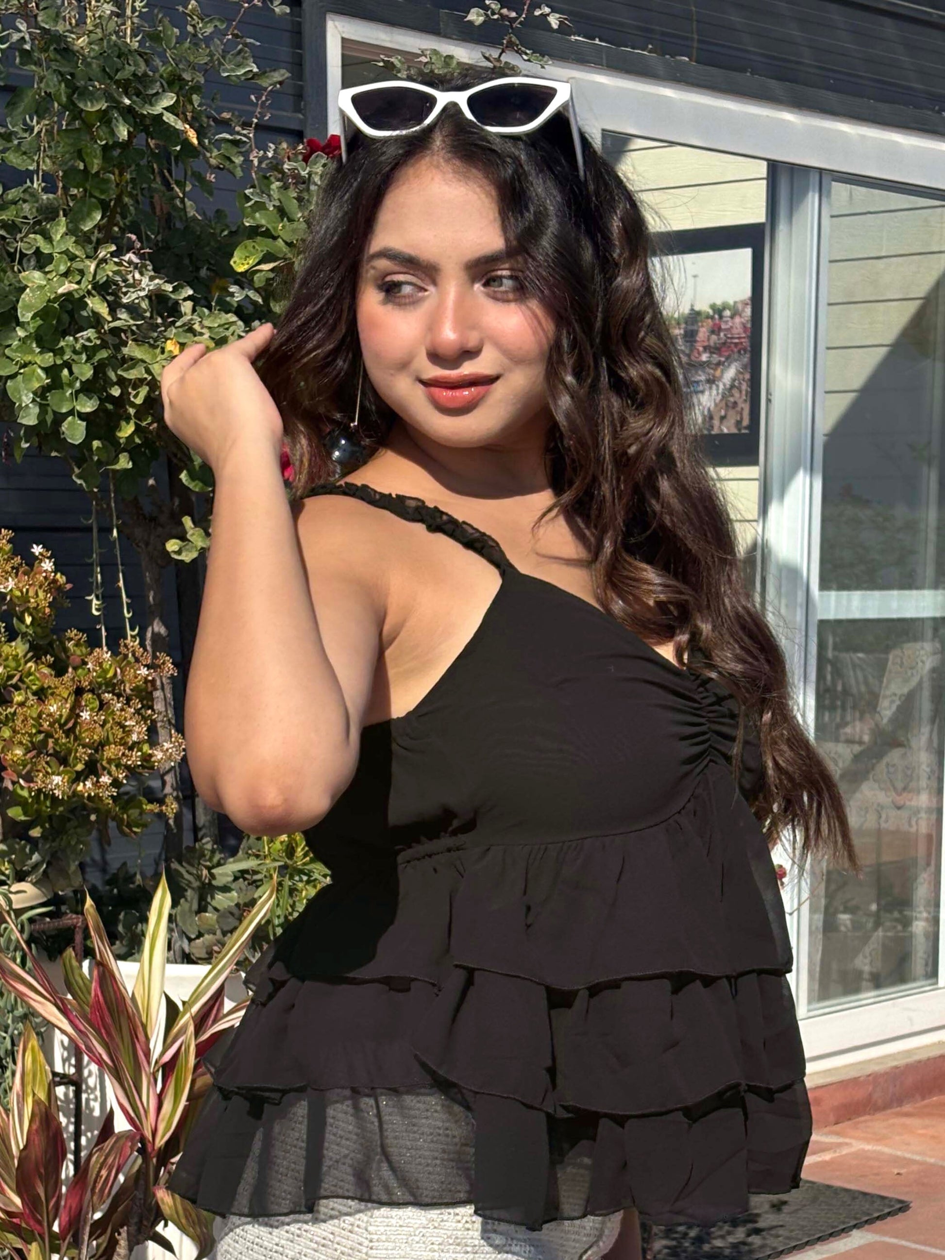 Elevate your wardrobe with our elegant black top featuring delicate ruffles that add a touch of sophistication to any outfit. Crafted from high-quality georgette fabric, this versatile piece is perfect for both casual outings and formal events. The flattering silhouette enhances your figure while providing comfort and style, making it a must-have addition to your collection. Pair it with jeans for a chic day look or dress it up with a skirt for an evening out.