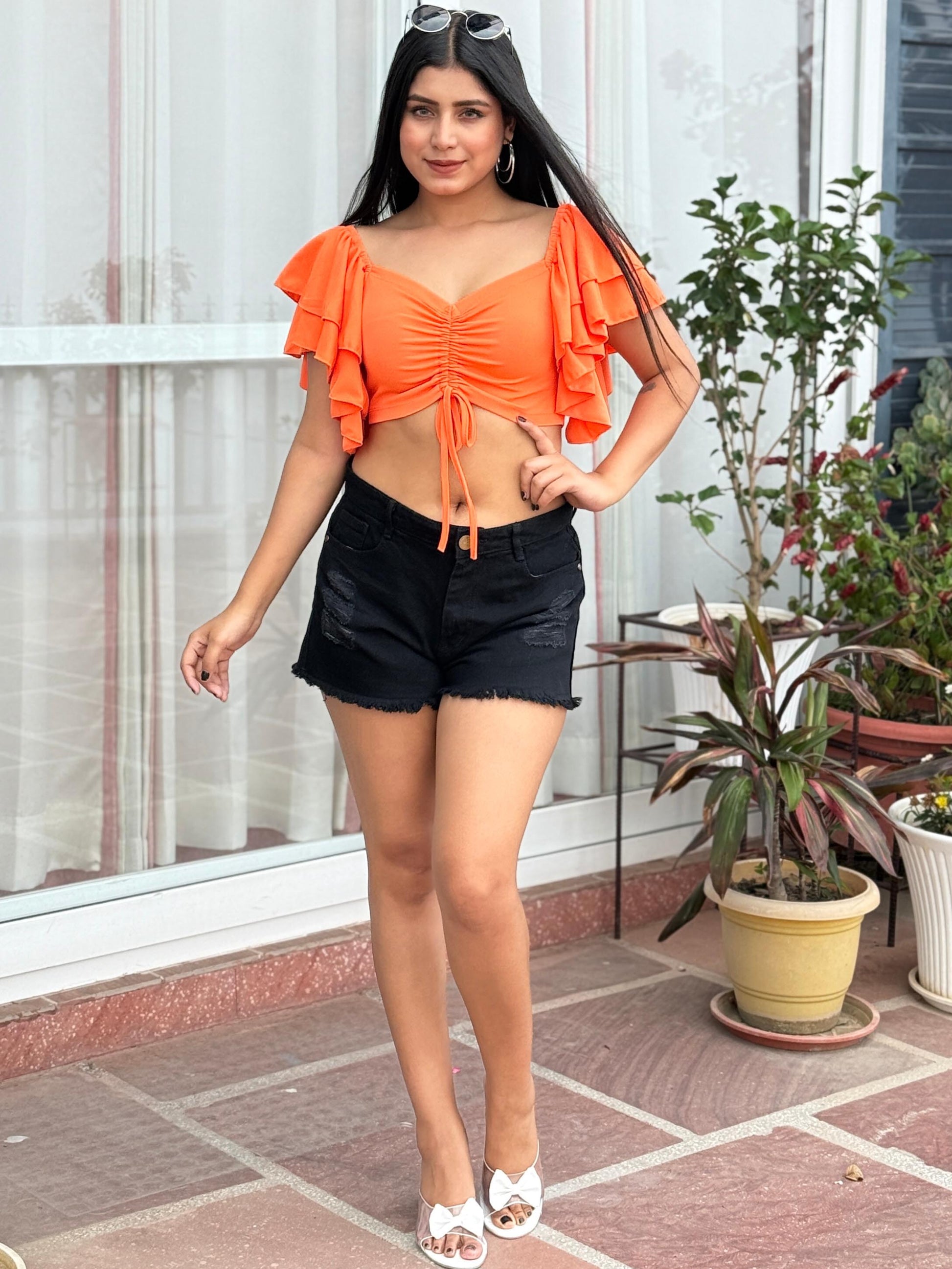 Elevate your wardrobe with this stunning orange top featuring elegant ruffled sleeves, perfect for adding a touch of sophistication to any outfit. Crafted from high-quality fabric, this top offers both comfort and style, making it ideal for both casual outings and more formal occasions. The vibrant hue and unique design ensure you stand out, while the ruffled sleeves provide a flattering silhouette that enhances your natural beauty. Pair it with jeans for a chic daytime look or dress it up with a skirt for an evening event.
