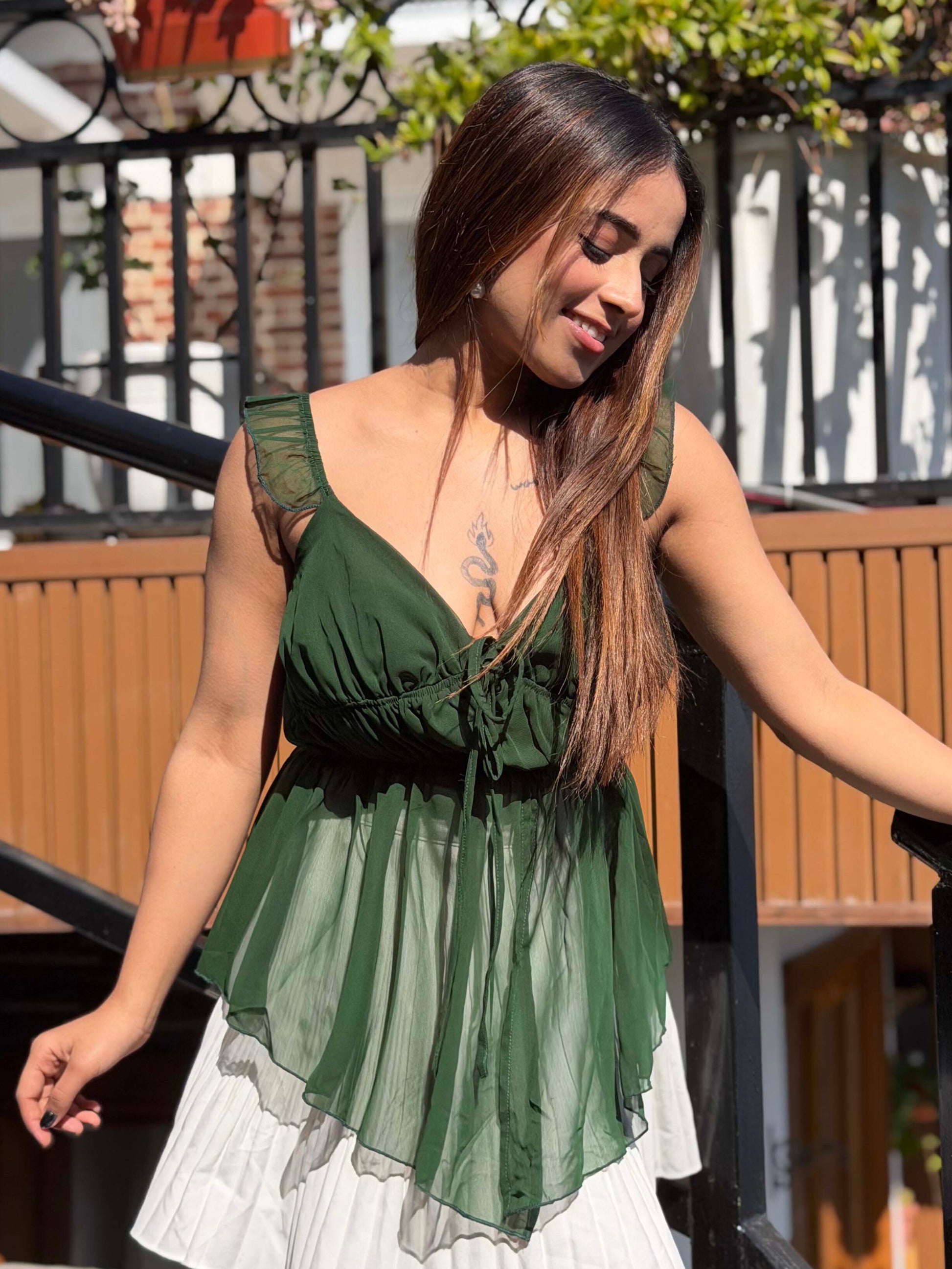 Elevate your wardrobe with this stunning green top, featuring elegant ruffled sleeves and a delicate sheer top that exudes sophistication. The vibrant hue complements a variety of skin tones, while the ruffles add a touch of femininity and flair. Perfect for both casual outings and special occasions, this top offers versatility and style, ensuring you stand out effortlessly. Embrace your inner fashionista and make a statement with this must-have piece. Made with soft georgette fabric.