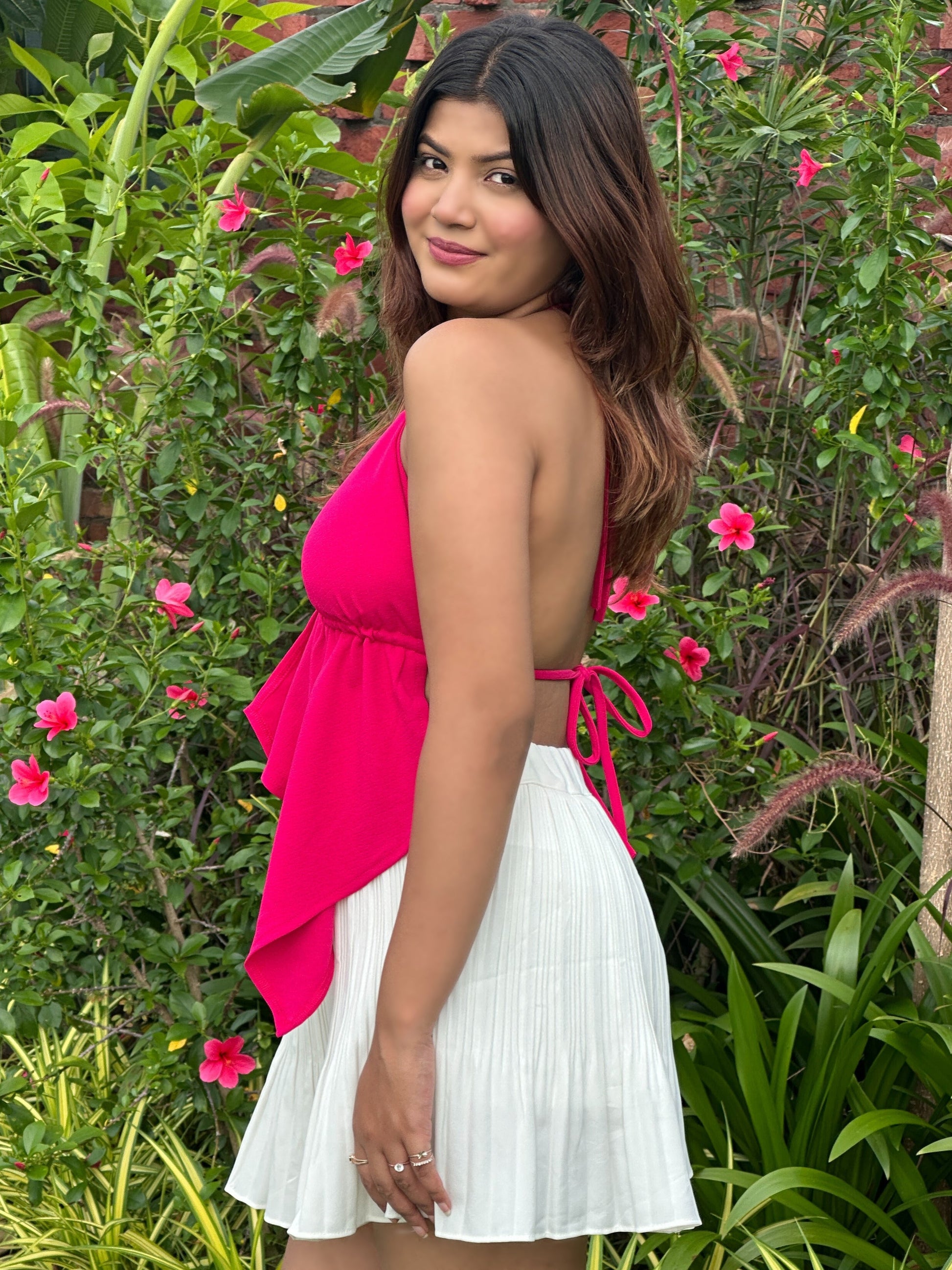 Elevate your wardrobe with this chic ensemble featuring a stylish pink top paired with a flattering skirt. The vibrant hue of the top adds a pop of color, making it perfect for both casual outings and more formal occasions. Crafted with high-quality materials, this outfit ensures comfort without compromising on style. Whether you're dressing up for a special event or looking for a trendy everyday look, this combination is versatile enough to meet all your fashion needs. Don't miss the chance to make a statement with this must-have addition to your collection.