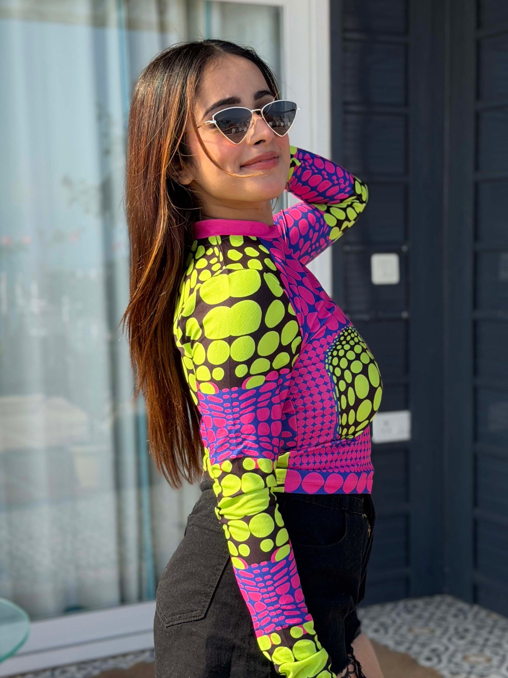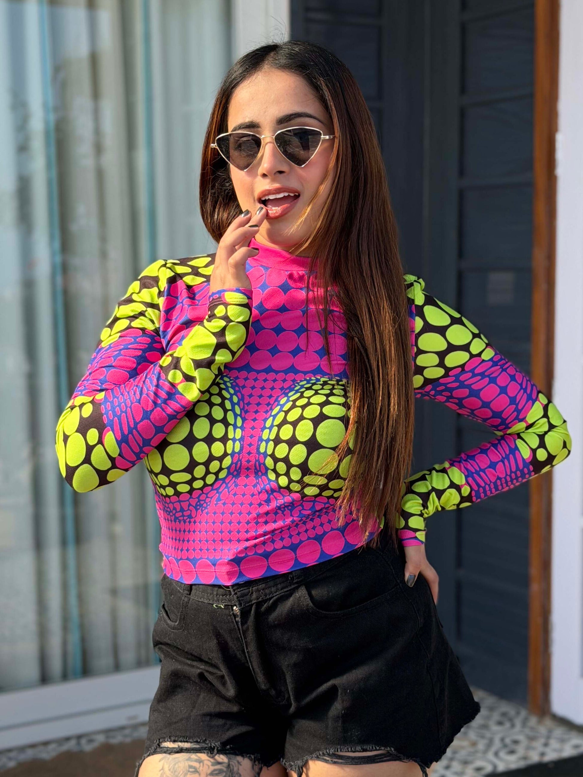 Elevate your wardrobe with this vibrant, eye-catching top . Crafted from high-quality lycra facric, this colorful piece is designed to make a statement while ensuring comfort and durability. Perfect for any occasion, whether you're dressing up for a night out or adding flair to your everyday look, this top is versatile and stylish. Don't miss the chance to enhance your collection with this must-have addition that promises to turn heads and spark conversations.