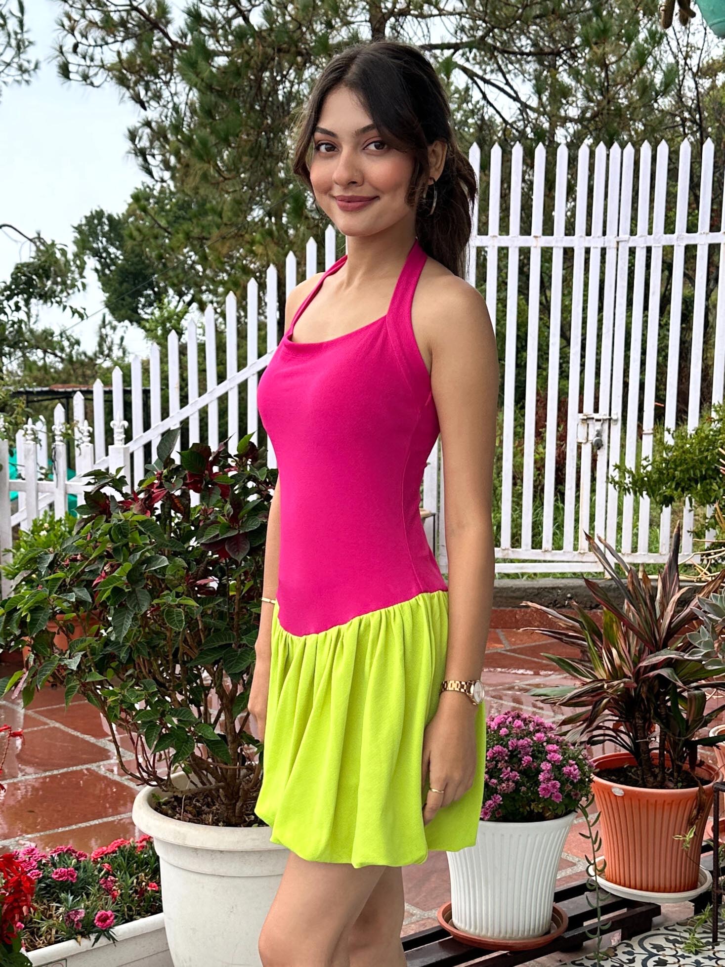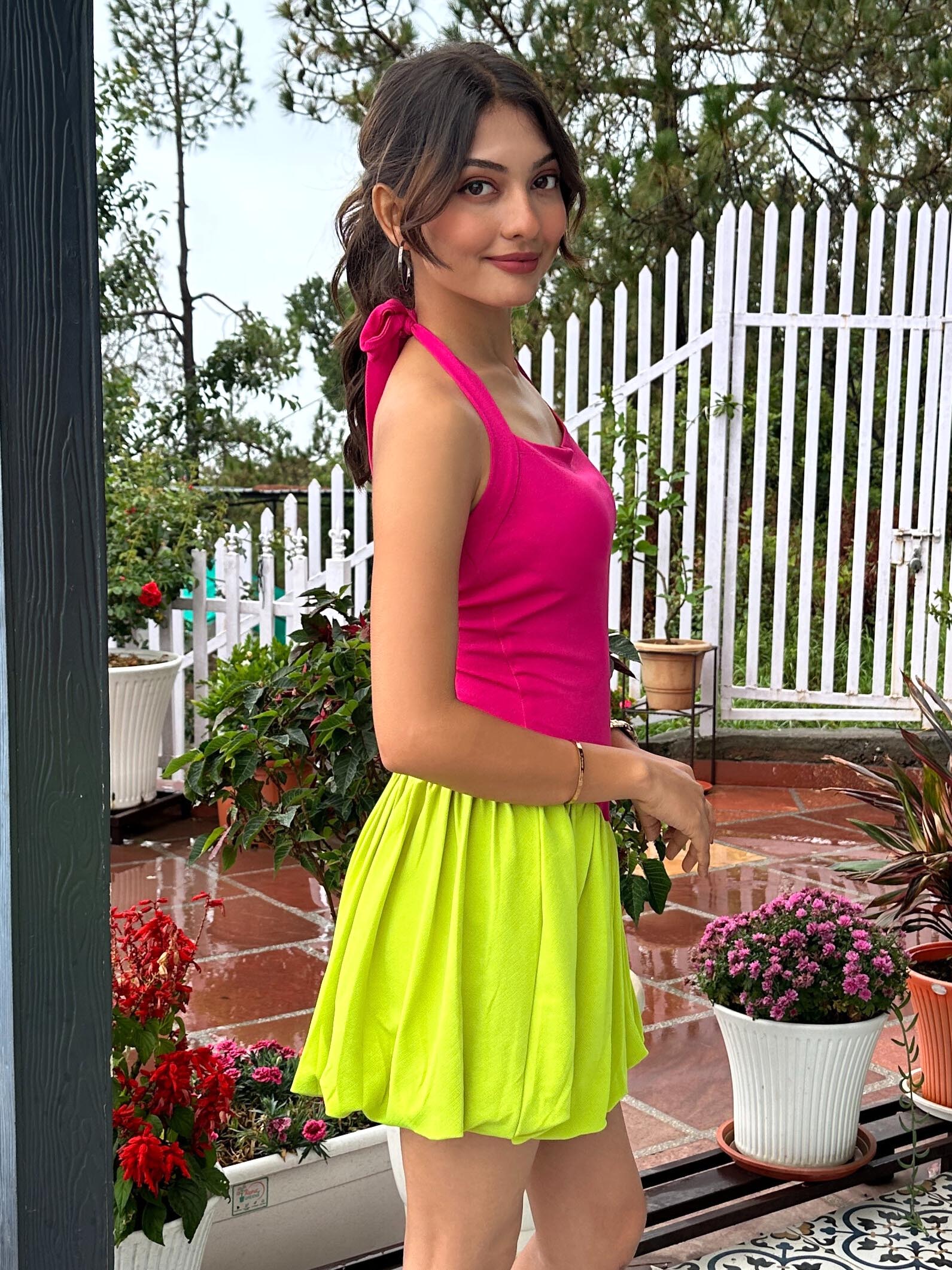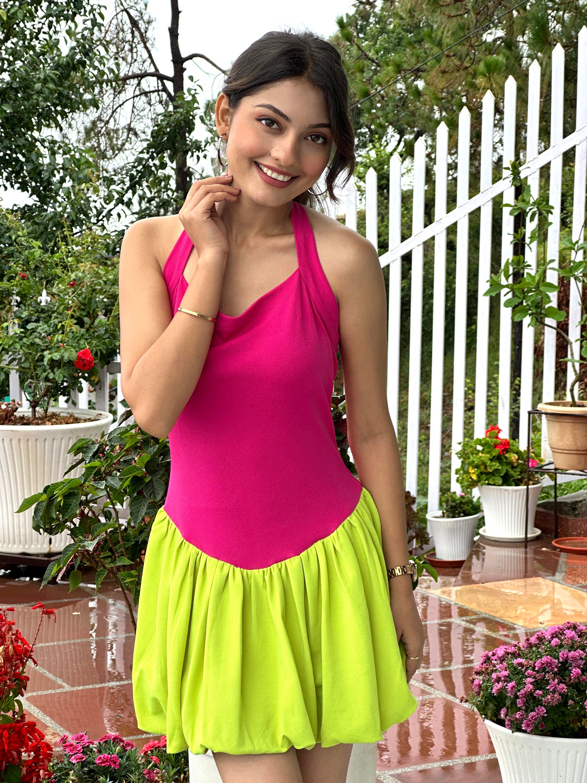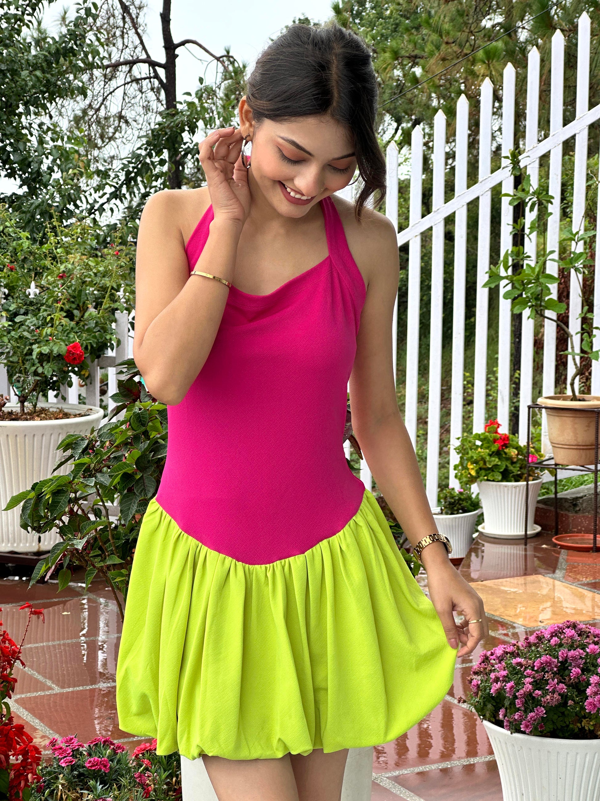 TANDUL Women Vibrant Pink and Green Balloon Dress